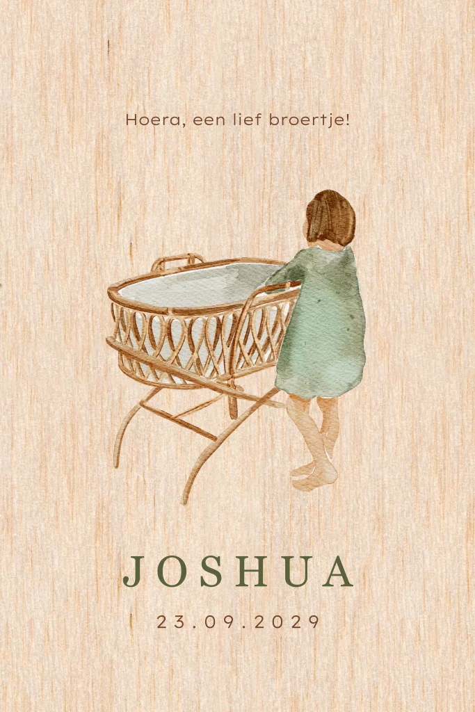 Houten geboortekaartje voor een tweede kindje met zus bij wiegje