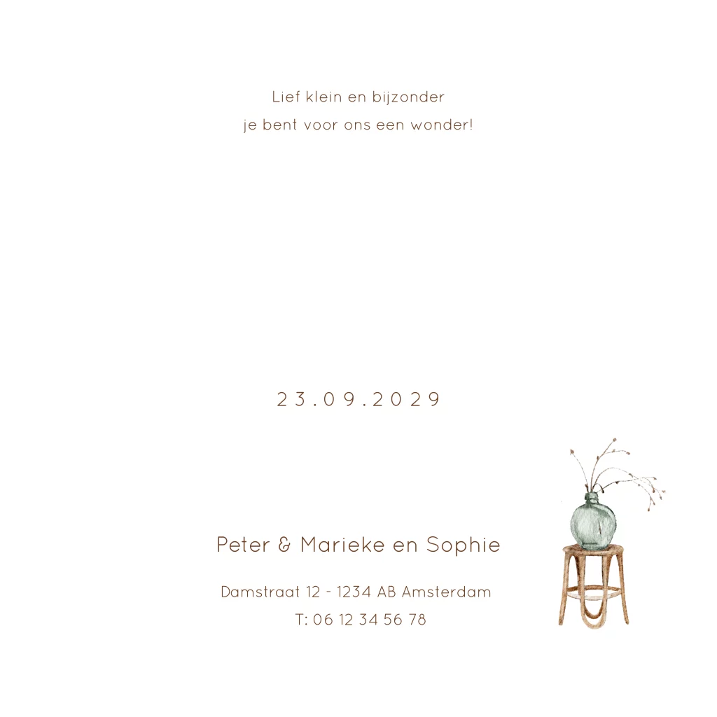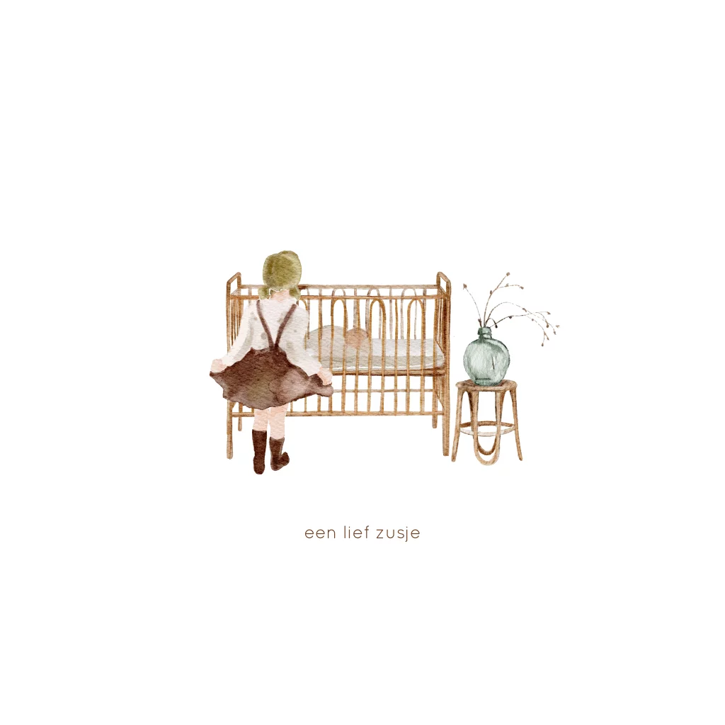 Krijgt jullie oudste dochter een zusje? Dan is dit geboorte kaartje echt wat voor jullie. De grote zus met een bruin jurkje kijkt in een wiegje naar de baby. Naast het bedje staat een vaas met takken. De illustraties op dit babykaartje voor een tweede kindje kan je zelf helemaal aanpassen.