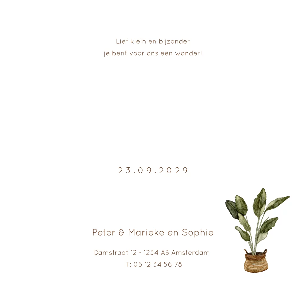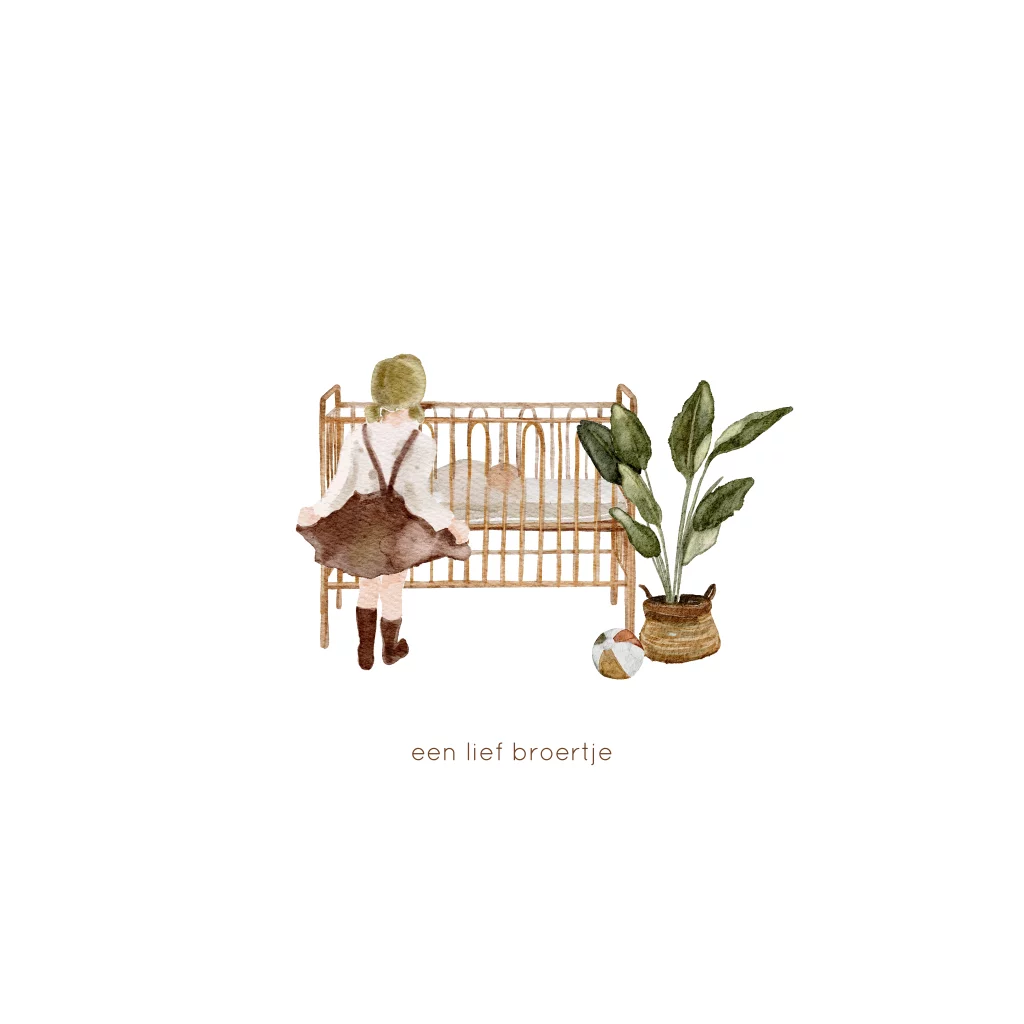 Krijgt jullie oudste dochter een broertje? Dan is dit een lief geboortekaartje. De grote zus kijkt in een ledikantje met het baby broertje. Naast het bedje staat een groene kamerplant en een voetbal. Uniek babykaartje voor een tweede kindje.