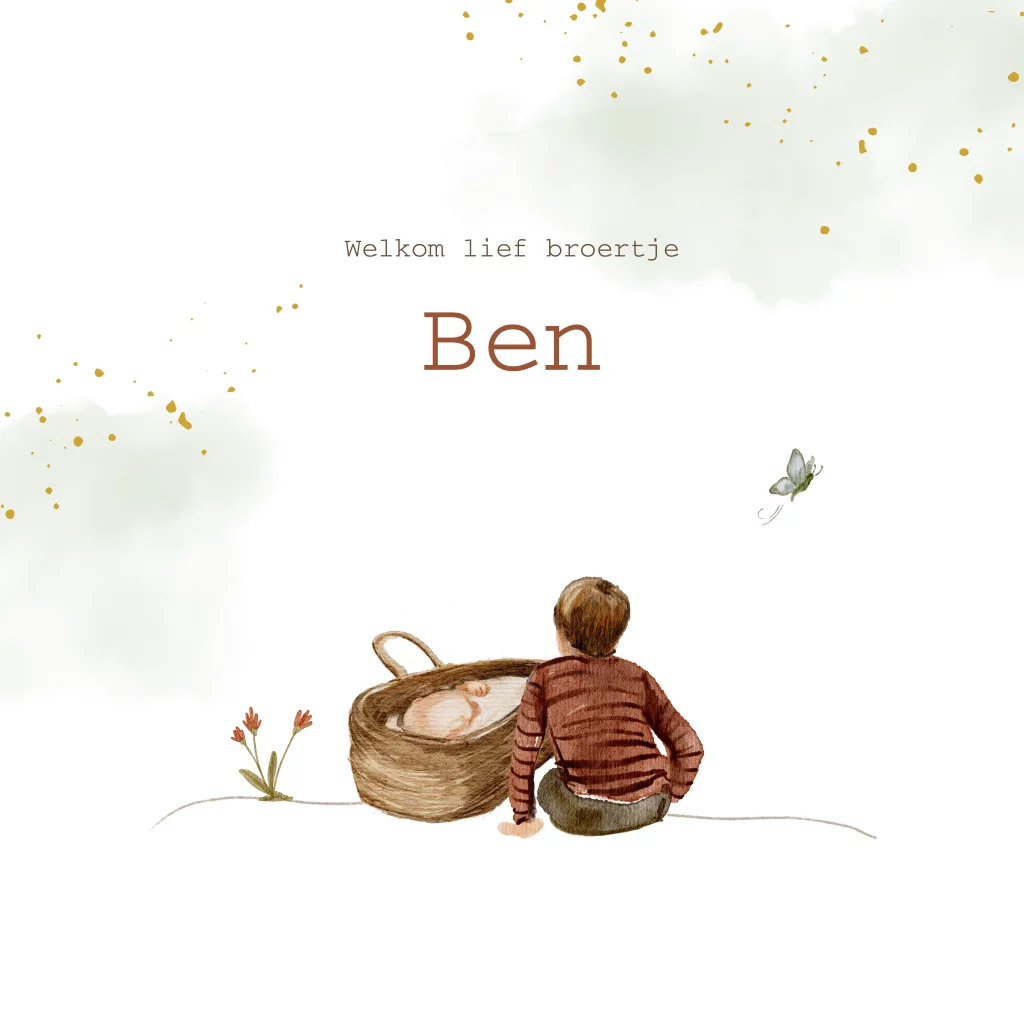 Vierkant enkel geboortekaartje voor een lente kindje. Dit kaartje is voor een tweede kindje. Bij een mandje met een baby zit een oudere broer. De groene waterverf achtergrond in combinatie met de spetters maken het kaartje helemaal af.