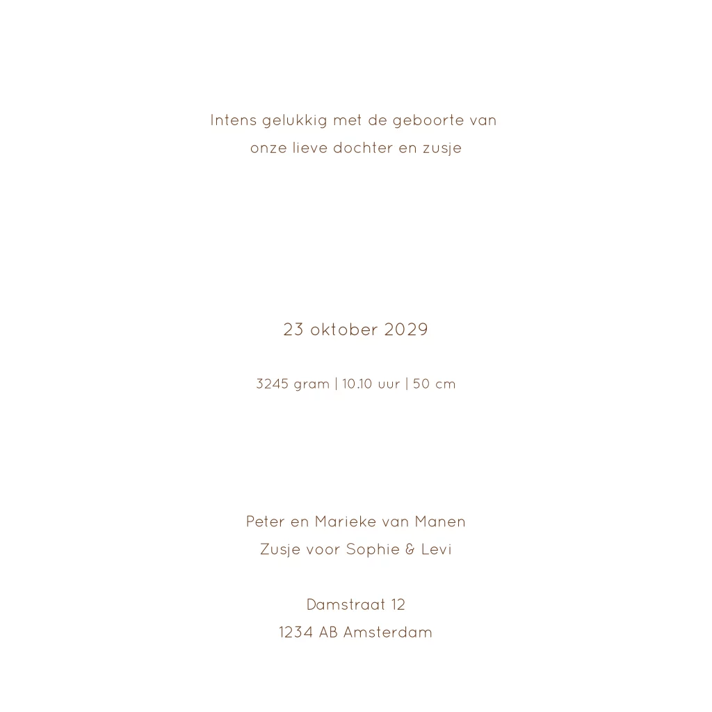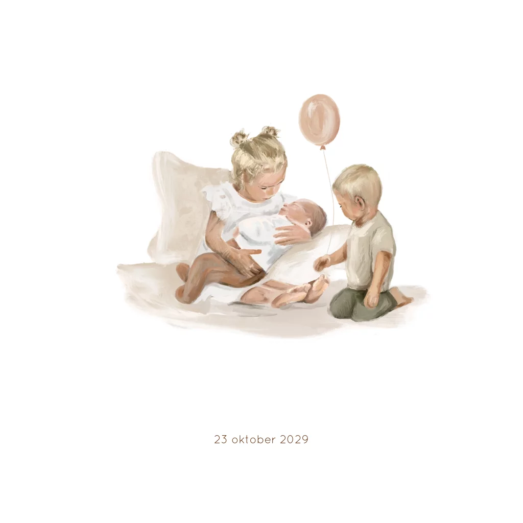 Origineel geboortekaartje voor een derde kindje. De illustraties zijn geverfd in zachte pasteltinten en krijgen zo een mooie en stijlvolle uitstraling.Op de illustratie zie je een oudere zus met een baby op schoot en daarbij zit een broertje met een roze ballon in zijn handje. Deze serie voor een derde kindje kunnen we ook aanpassen als je een andere gezinssamenstelling hebt.