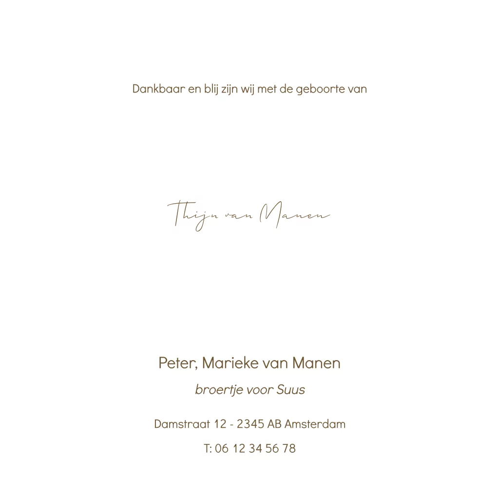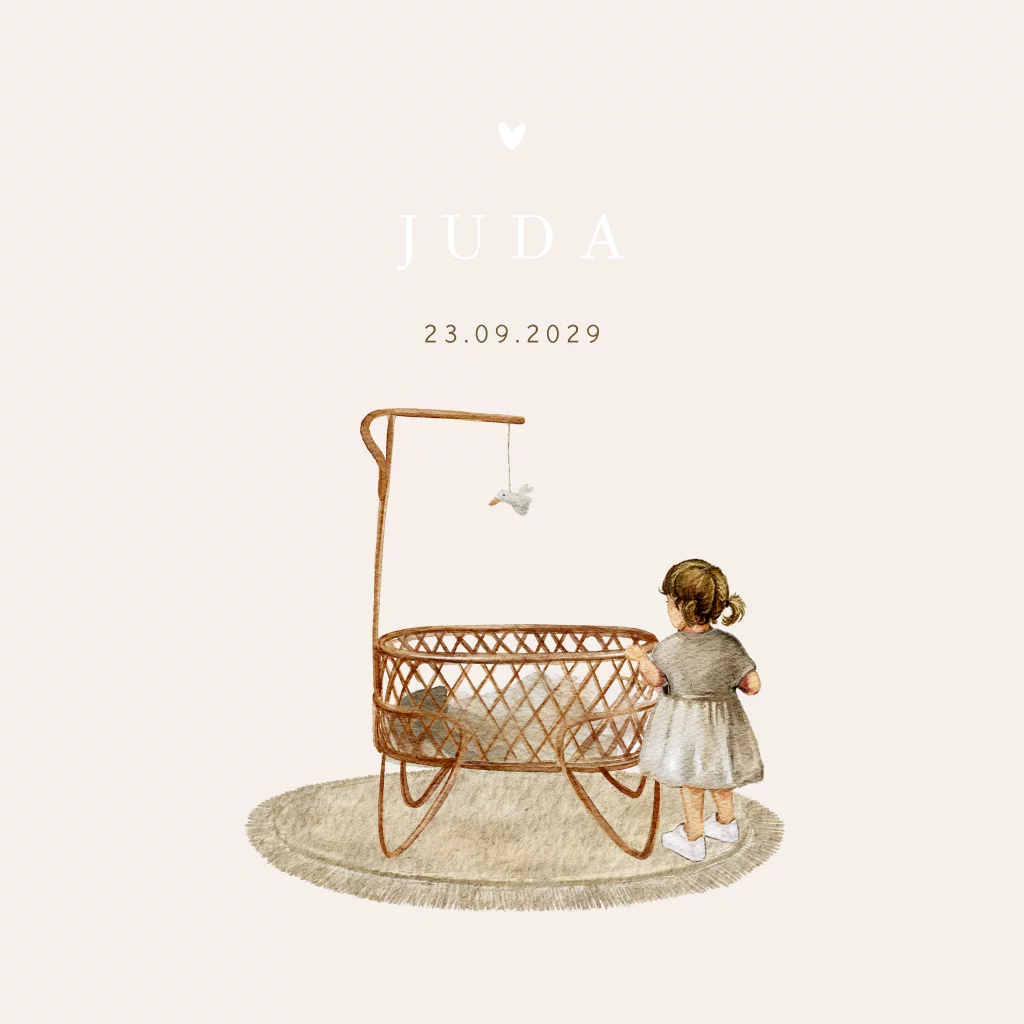 Welkom bij ons prachtige neutrale geboortekaartje voor een tweede kindje! Dit aquarel getekende kaartje is perfect voor gezinnen met een ouder zusje die vol verwachting over de rand van de wieg kijkt. De achtergrond in een zachte crèmekleur maakt dit kaartje geschikt voor zowel jongens als meisjes. Bovendien is dit kaartje volledig aanpasbaar, dus als je een andere gezinssamenstelling hebt, kun je dit eenvoudig aanpassen naar jouw wensen. Dit illustratieve kaartje straalt liefde en luxe uit, met prachtige goudfolie accenten die de details doen stralen. Of je nu een zoontje, dochtertje of beide verwacht, dit kaartje is een perfecte keuze. De toevoeging van aquarel tekeningen van broertjes en zusjes maakt dit kaartje extra speciaal en geschikt voor gezinnen van alle samenstellingen. Of je nu op zoek bent naar een kaartje voor je zoon, dochter of allebei, dit neutrale geboortekaartje is een prachtige keuze die de blijde aankondiging van jullie nieuwe gezinslid perfect weergeeft. Maak dit kaartje helemaal van jou door het zelf te bewerken en aan te passen aan jullie persoonlijke stijl.