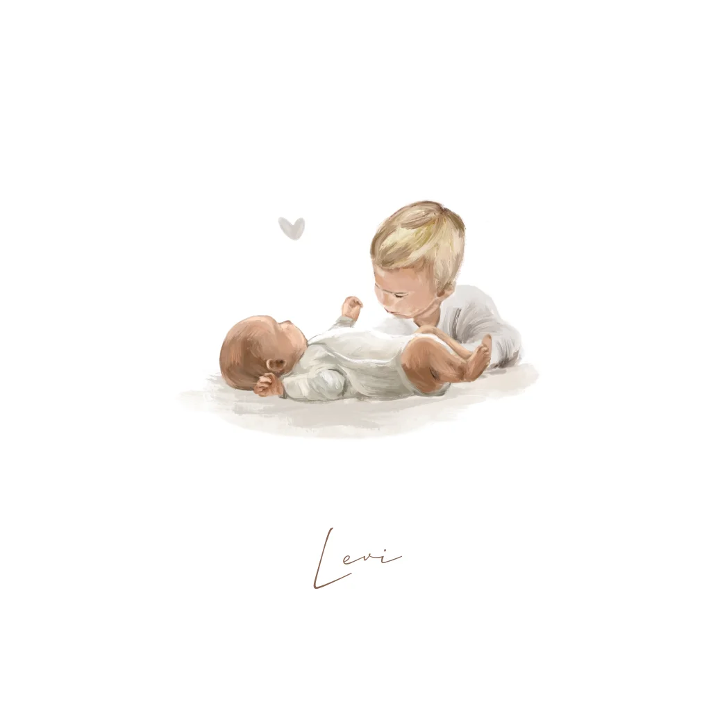 Wat een schattige geboortekaartje is dit voor jullie zoontje. Op het vierkante kaartje staat een illustratie van een baby met een ouder broertje. Unieke tekeningen die we in verschillende gezinssamenstellingen kunnen maken.