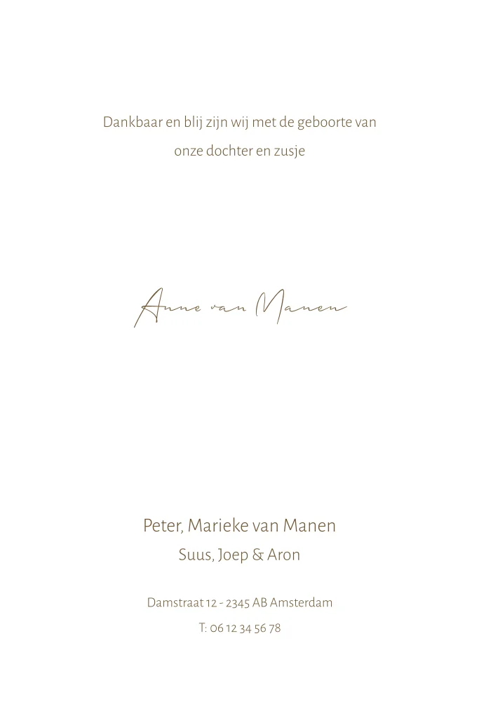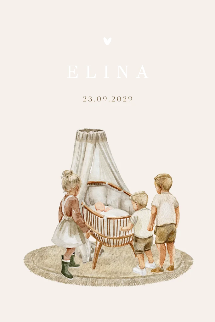 Wat een prachtig geboortekaartje voor een vierde kindje is dit. Bij een mooie wieg met een hemeltje staan drie oudere kindjes. Een zus, broer en broertje in mooi aquarel tekening. Heb je een andere gezinssamenstelling, kan je dit natuurlijk zelf aanpassen.De achtergrond is creme en de naam wordt gedrukt in koperfolie. Dit kaartje kan je helemaal zelf bewerken en aanpassen.