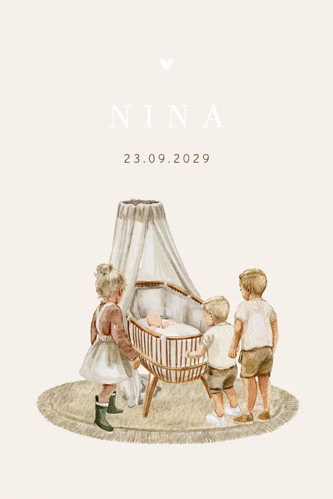 Wat een prachtig geboortekaartje voor een vierde kindje is dit. Bij een mooie wieg met een hemeltje staan drie oudere kindjes. Een zus, broer en broertje in mooi aquarel tekening. Heb je een andere gezinssamenstelling, kan je dit natuurlijk zelf aanpassen.De achtergrond is creme en de naam wordt gedrukt in goudfolie. Dit kaartje kan je helemaal zelf bewerken en aanpassen.