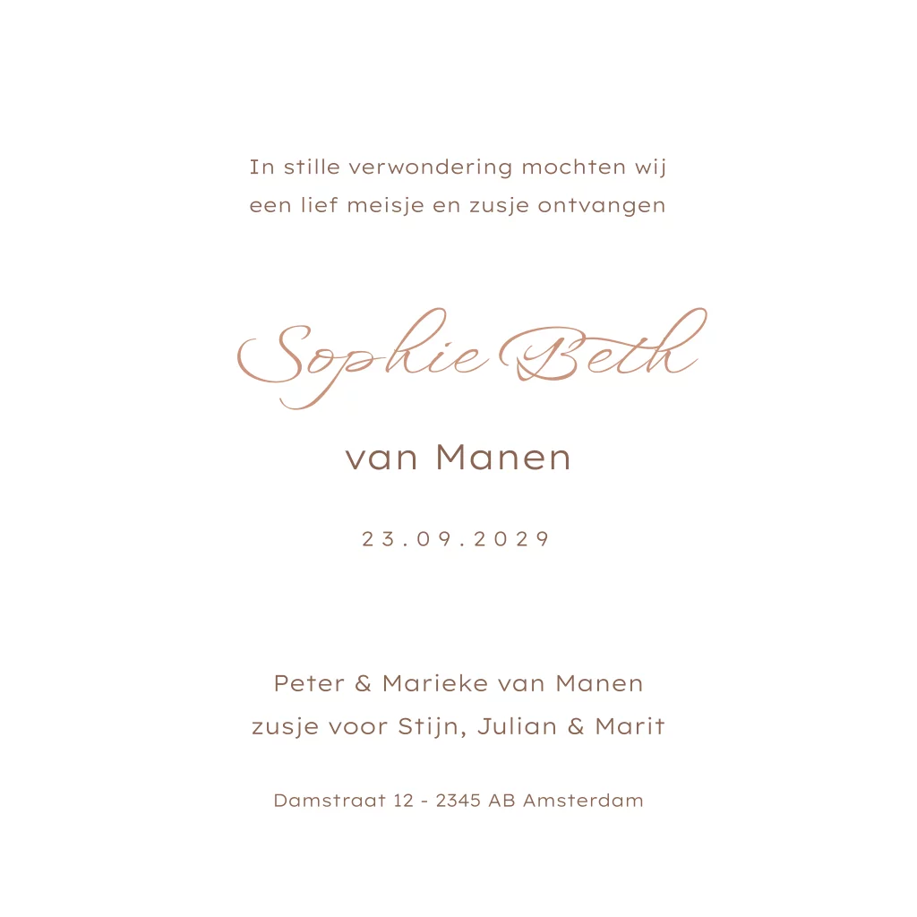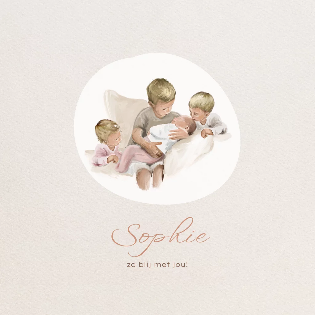 Uniek geschilderd geboortekaartje in olieverf stijl. De illustratie bevat een broer op de bank met een baby in zijn armen. Daarnaast staat nog een broertje die de baby een kusje op zijn hoofd geeft. Aan de andere kant een klein meisje. Dit getekende geboortekaartje is prachtig voor jullie vierde kindje.
