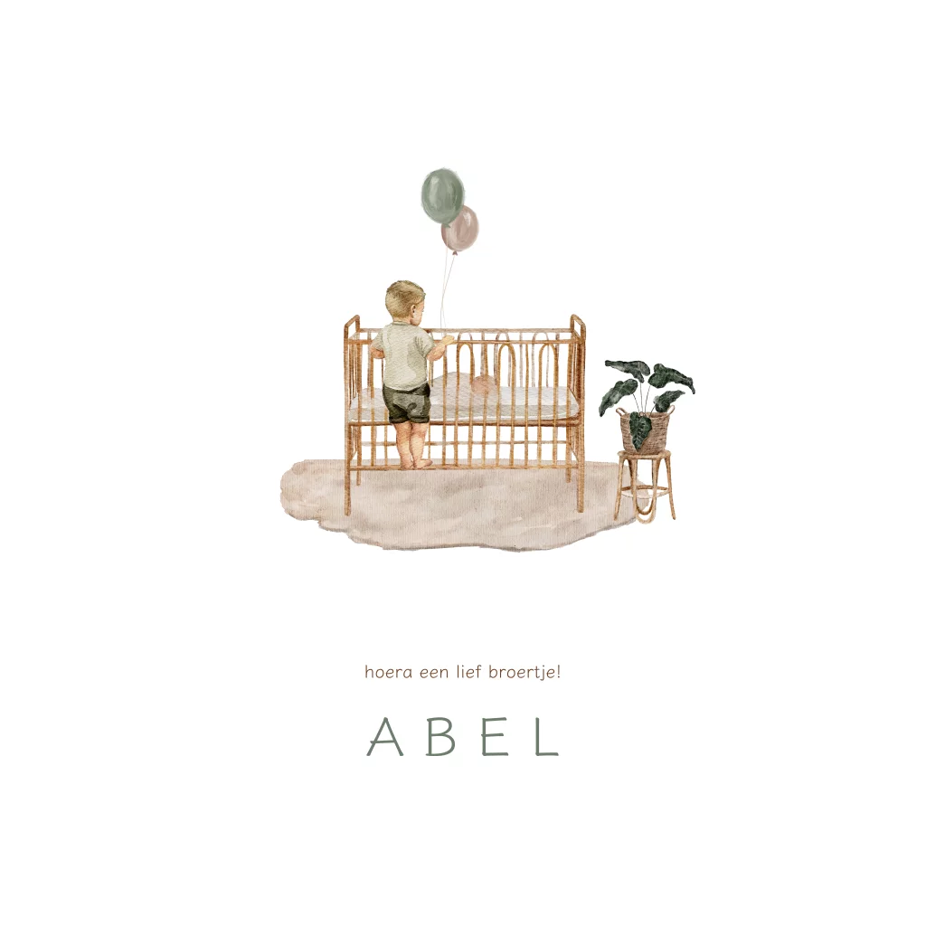 Lief geboortekaartje voor een broertje. In het ledikant ligt een baby en een broertje staat op het randje te kijken naar de baby. Hij heeft een groene en taupe ballon in zijn handjes. Uniek getekend geboortekaartje voor een tweede kindje.