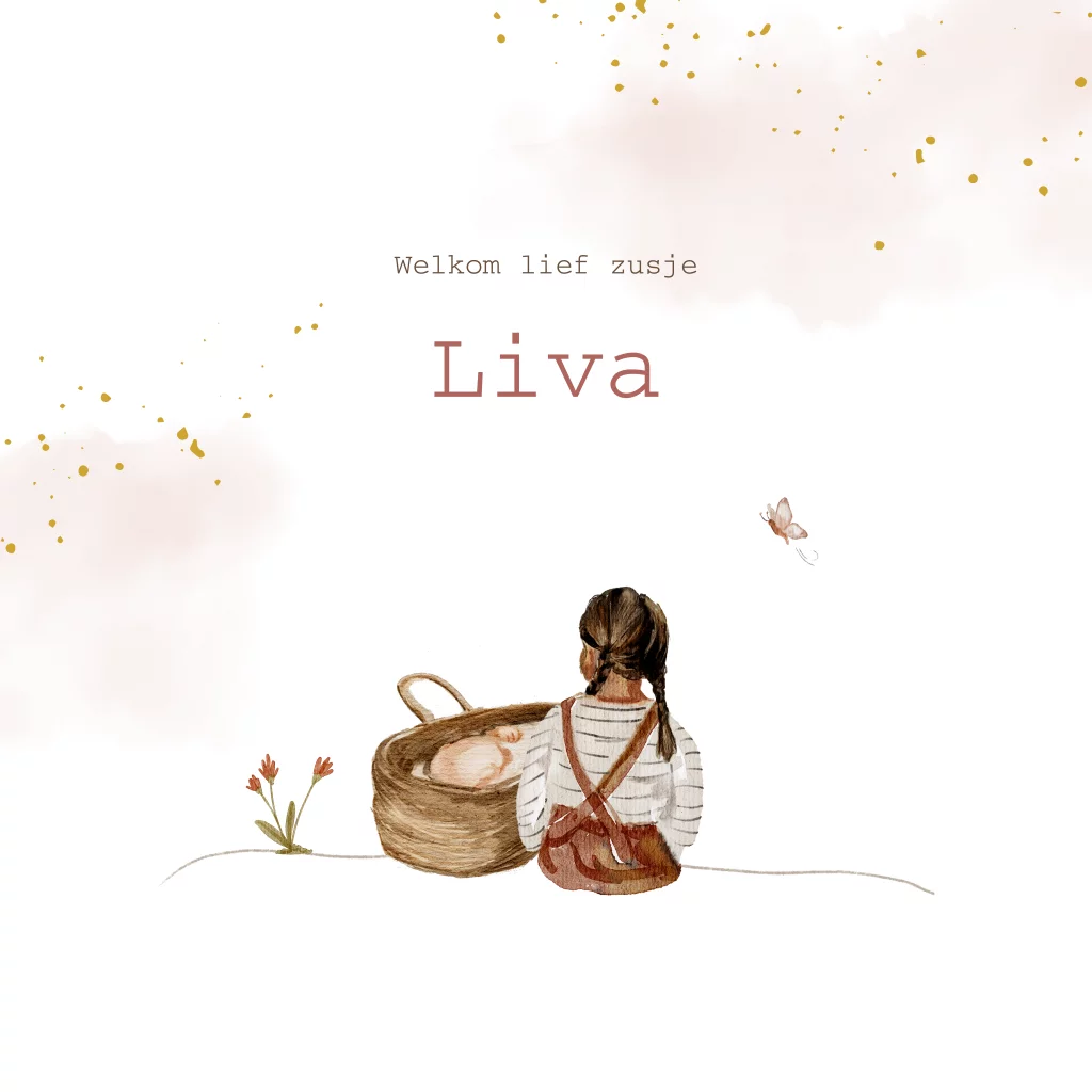 Vierkant geboortekaartje voor een zusje met een oudere zus bij een mandje met een baby. Op het kaartje staan roze waterverf vlekken met gele spetters. Het oudere meisje kan je ook vervangen door een jongen.