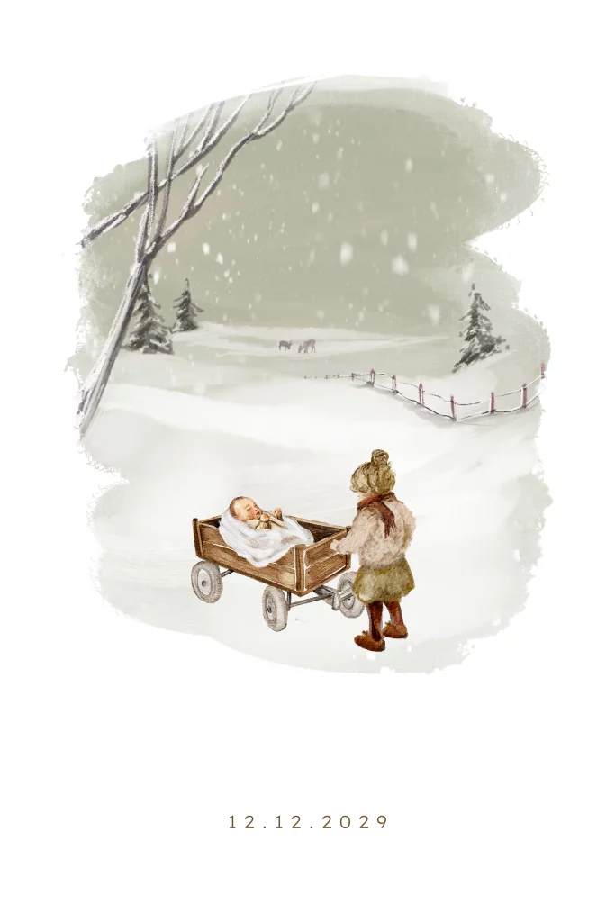 Wat een mooi getekend geboortekaartje is dit. De achtergrond heeft een tekening van een landschap met sneeuw en voorop staat een bolderkar met een baby. Daarnaast een ouder zusje. Lief geboortekaartje voor een tweede kind, maar je kunt het ook aanpassen met andere illustraties van kindjes. De naam is gedrukt in goudfolie.