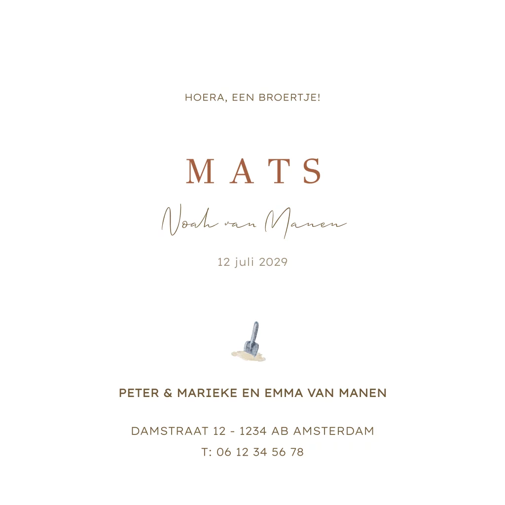 Lief zomer geboortekaartje voor een broertje. Op de aquarel illustratie staat een grote zus met een broertje op een handdoek in het zand. De gestreepte parasol maakt dit babykaartje helemaal af. Je kunt de illustraties op dit kaartje zelf bewerken.