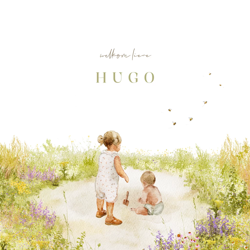 Zomer geboortekaartje met prachtig getekende veldbloemen. Dit kaartje is leuk voor een zomerbaby. Temidden van vrolijk gekleurde bloemen in geel en paars staat een oudere zus bij een jongetje die zit te spelen met zand. Super schattig kaartje voor een tweede kindje. Je kunt de kindjes op dit kaartje ook vervangen door andere illustraties van kinderen.