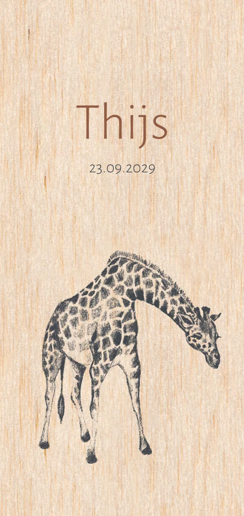 Prachtig origineel geboortekaartje gedrukt op echt hout. Daarop een illustratie van een getekende giraffe die naar beneden kijkt. In onze beeldbank vind je nog veel meer van deze tekeningen.