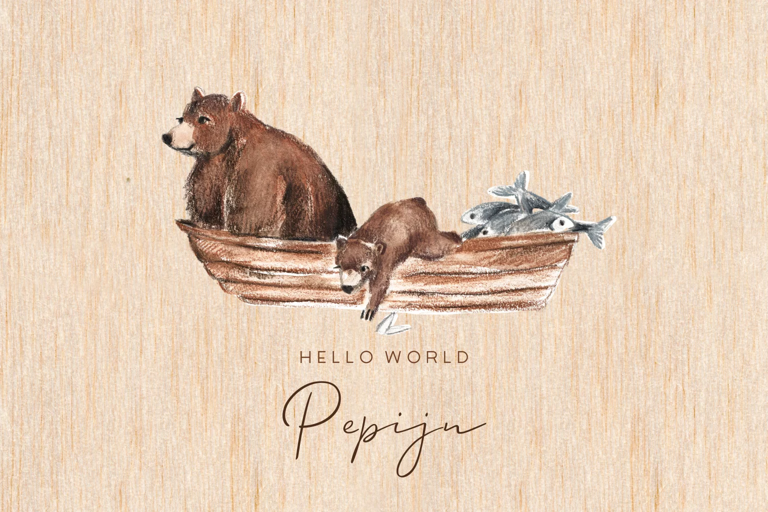 Geboortekaartje van hout met een illustratie van beren in een boot. Het kleine beertje hangt uit de boot met zijn pootje in het water. Achterin de boot ligt een stapel vissen. Origineel jongenskaartje.