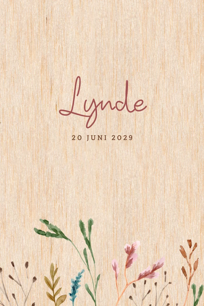 Lief houten geboortekaartje met onderaan het kaartje fleurige takjes. De kleuren zijn roze, groen en bruin. Schattig kaartje voor een pasgeboren meisje.