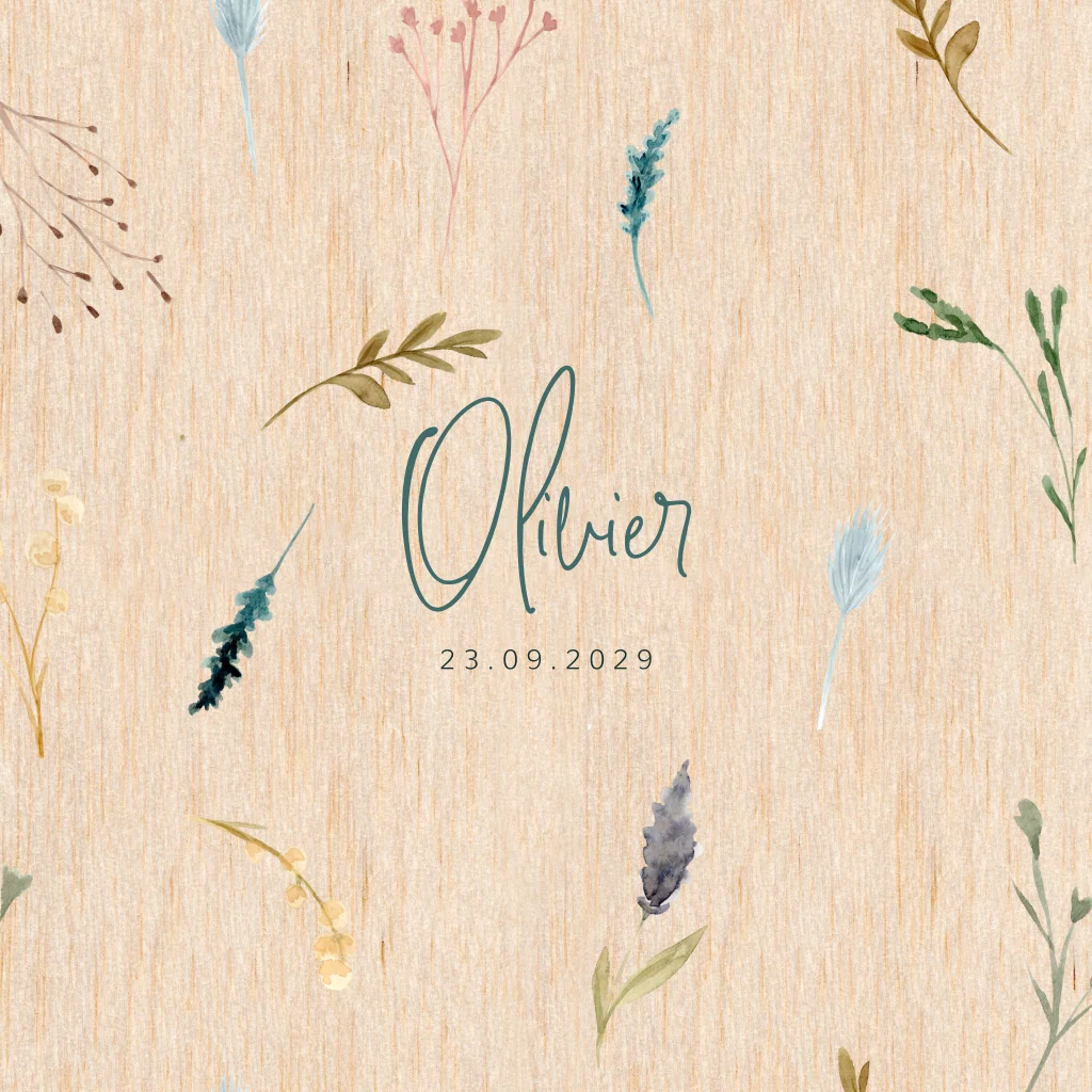 Houten geboortekaartje voor een jongen met blauwe en groene takjes