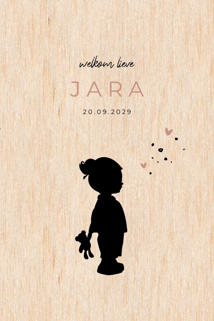 Echt houten geboortekaartje met een silhouet van een meisje met beer