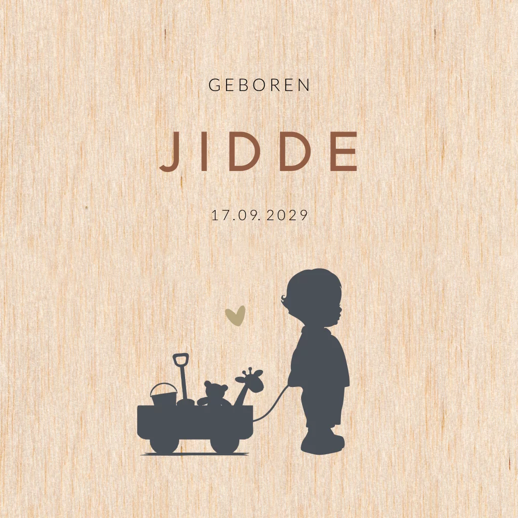 Echt houten geboortekaartje met een silhouet van een jongen met een speelgoed kar. Daarbij staat een klein hartje.