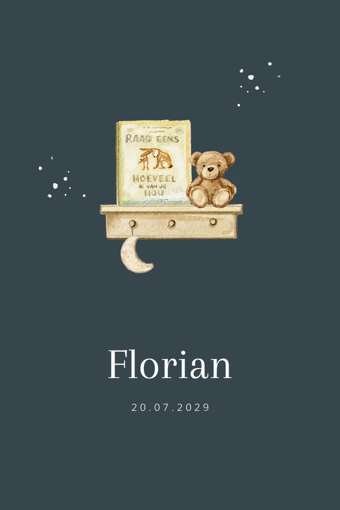 Mooi geboortekaartje uit onze serie getekende geboortekaartjes. Blauwe achtergrond met illustraties van een babykamer. Op de wandplank staat een teddybeer en een boekje. Daaromheen gouden spetters. De naam staat in goudfolie wat dit babykaartje een extra luxe uitstraling geeft. Dit geboortekaartje is volledig aanpasbaar, waardoor je de mogelijkheid hebt om het kaartje naar wens te bewerken. Voeg je eigen persoonlijke touch toe en maak het kaartje uniek voor de komst van jullie kleintje.