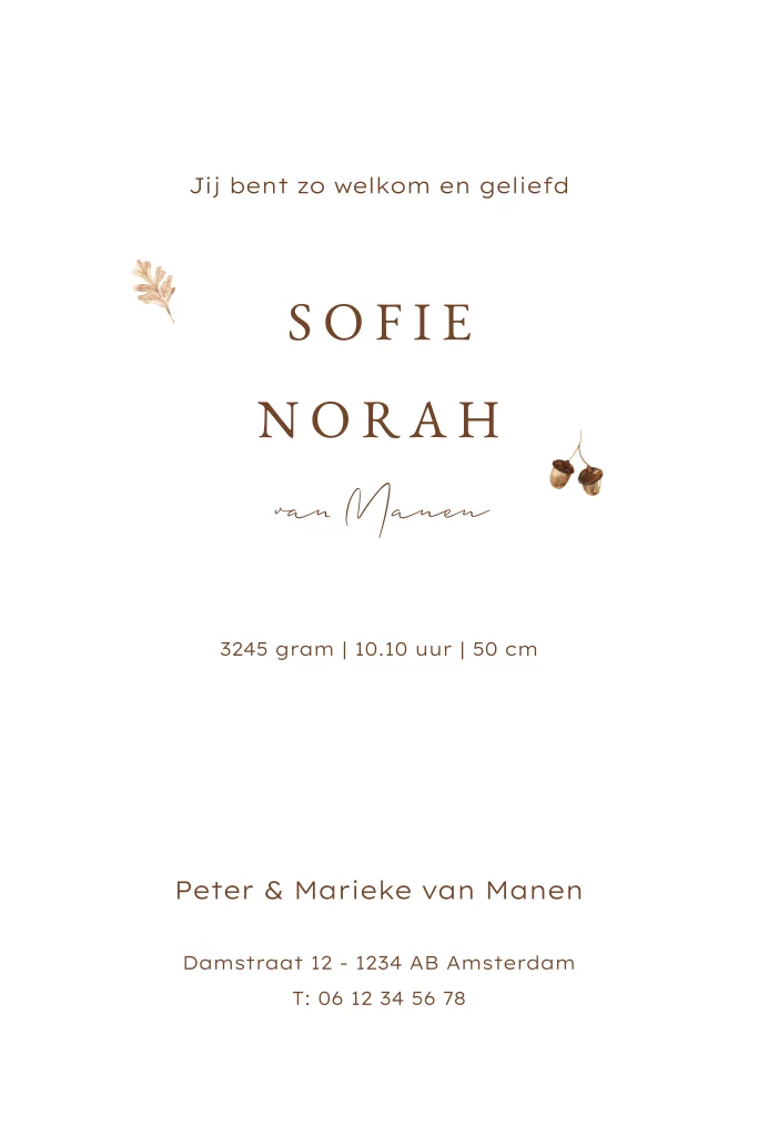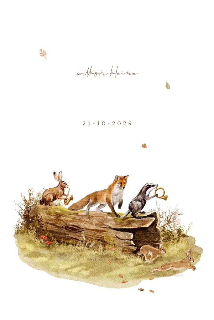 Prachtig geboortekaartje met mooi goudfolie. Dit bosdieren kaartje is zo vrolijk. Een haas en een das hebben instrumentjes en in het midden loopt een vos. Je kunt dit dierenkaartje zelf bewerken en aanpassen. Je kunt ook andere dieren toevoegen naar wens.