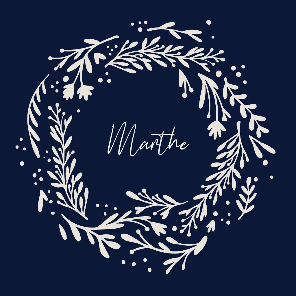 Chique geboortekaartje voor een meisje met een krans van fijne takjes en goudfolie. Wil je een andere kleur folie dan kan je dat eenvoudig aanpassen. De achtergrond is diep donkerblauw en kan je zelf aanpassen.