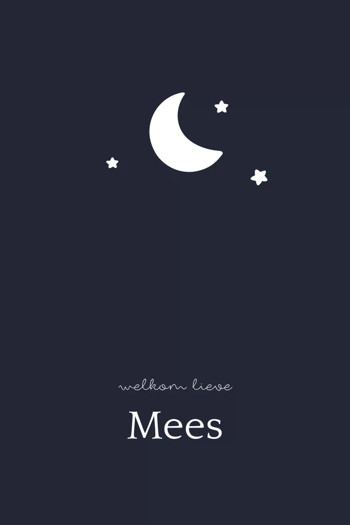 Prachtig donkerblauw geboortekaartje voor een jongen. Op het kaartje staat een gouden maan en sterretjes die in goudfolie worden gedrukt. Ook de naam komt in glanzend folie. Een stijlvol kaartje voor jullie zoon.