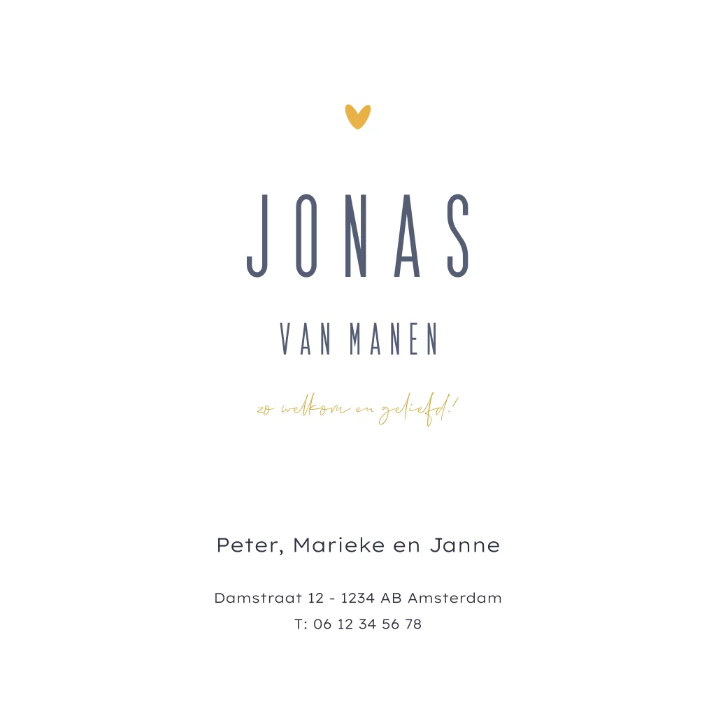 Donkerblauw geboortekaartje jongen met betonlook en goudfolie hartje