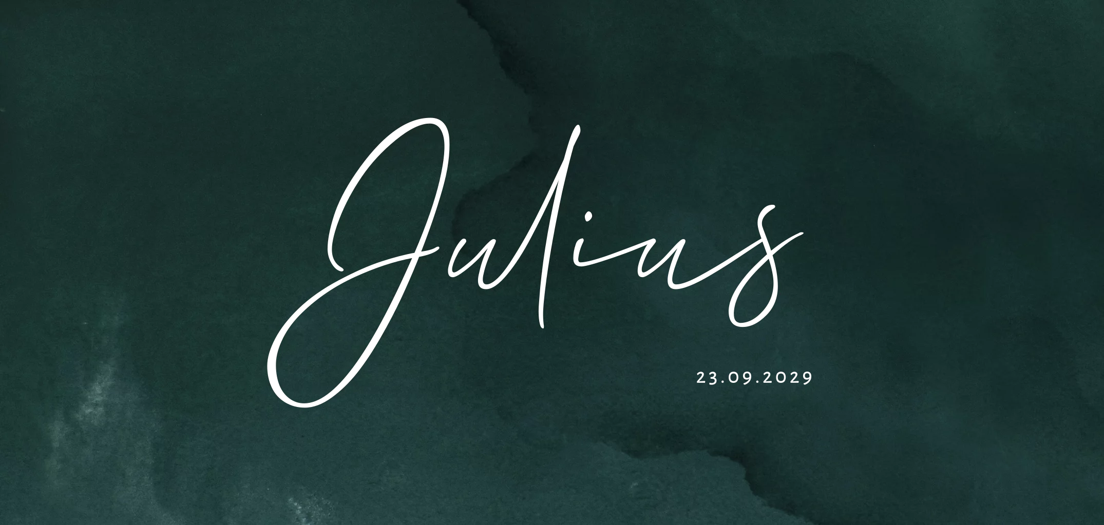Prachtig stijlvol geboortekaartje voor een jongen. De achtergrond is donkergroen en heeft een waterverf effect. De naam van het kindje is gedrukt in glanzend goudfolie. Liever een andere kleur folie, pas die dan eenvoudig aan in onze editor. Bestel een eerste proefdruk en je zult verrast zijn over de kwaliteit.