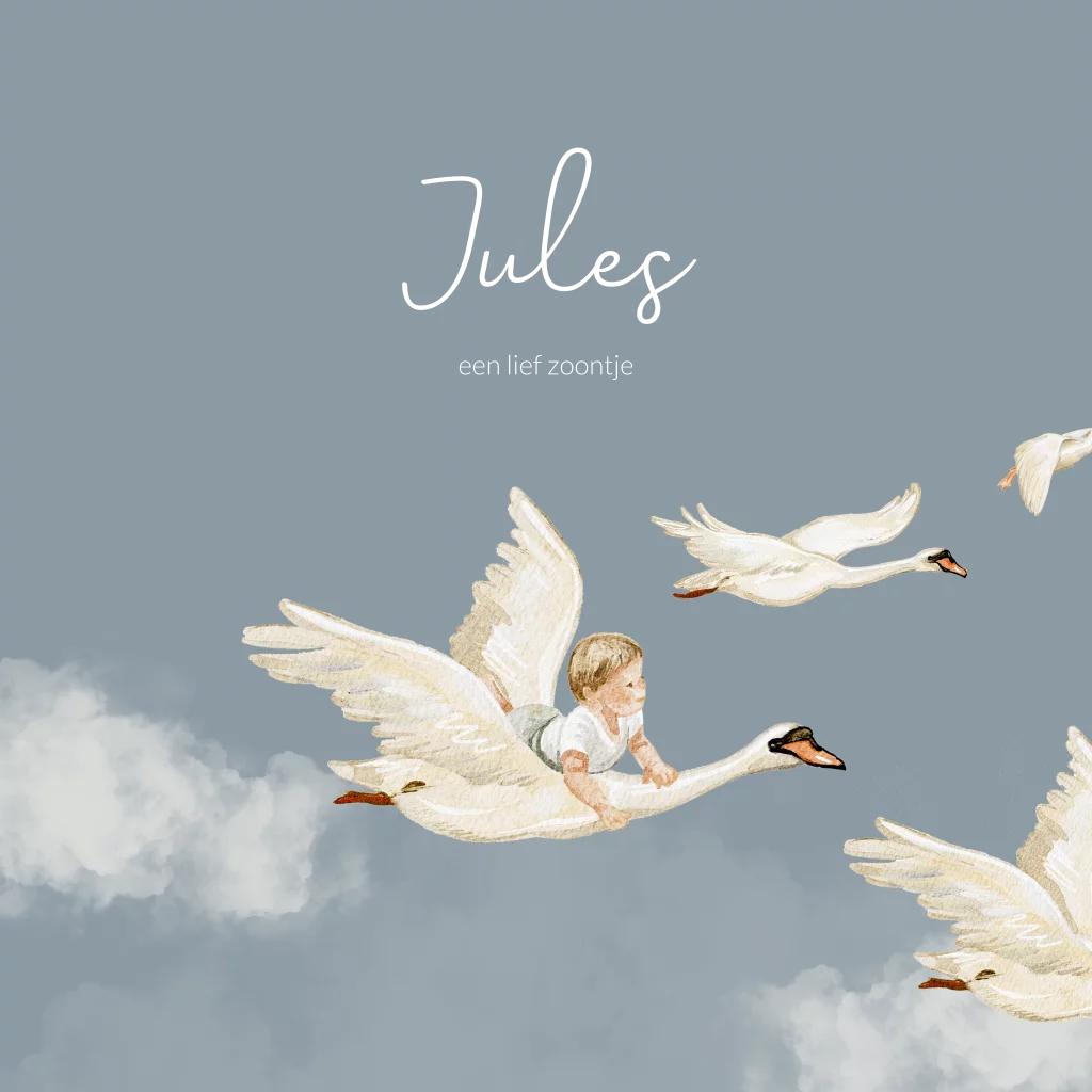 Op zoek naar een betoverend geboortekaartje voor de komst van jullie zoontje? Ontdek ons dromerige geboortekaartje in blauw met prachtige zwanen en een schattige baby. De achtergrond is blauw en daarop staan witte wolken. Op de rug van een zwaan zit een klein jongetje. De naam van de baby wordt gedrukt in glanzend goudfolie, evenals de spetters. Je kunt dit kaartje helemaal zelf bewerken en aanpassen.