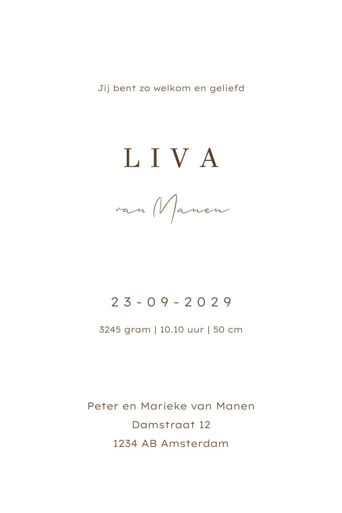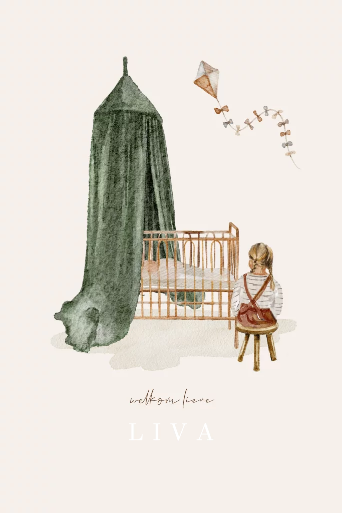 Lief getekend geboortekaartje voor een jongen of meisje met een wieg met een groene klamboe. Bij de wieg zit een grote zus op een krukje. De naam wordt in goudfolie gedrukt en het kaartje heeft ronde hoeken. Je kunt dit kaartje helemaal zelf aanpassen naar je eigen gezinssamenstelling.