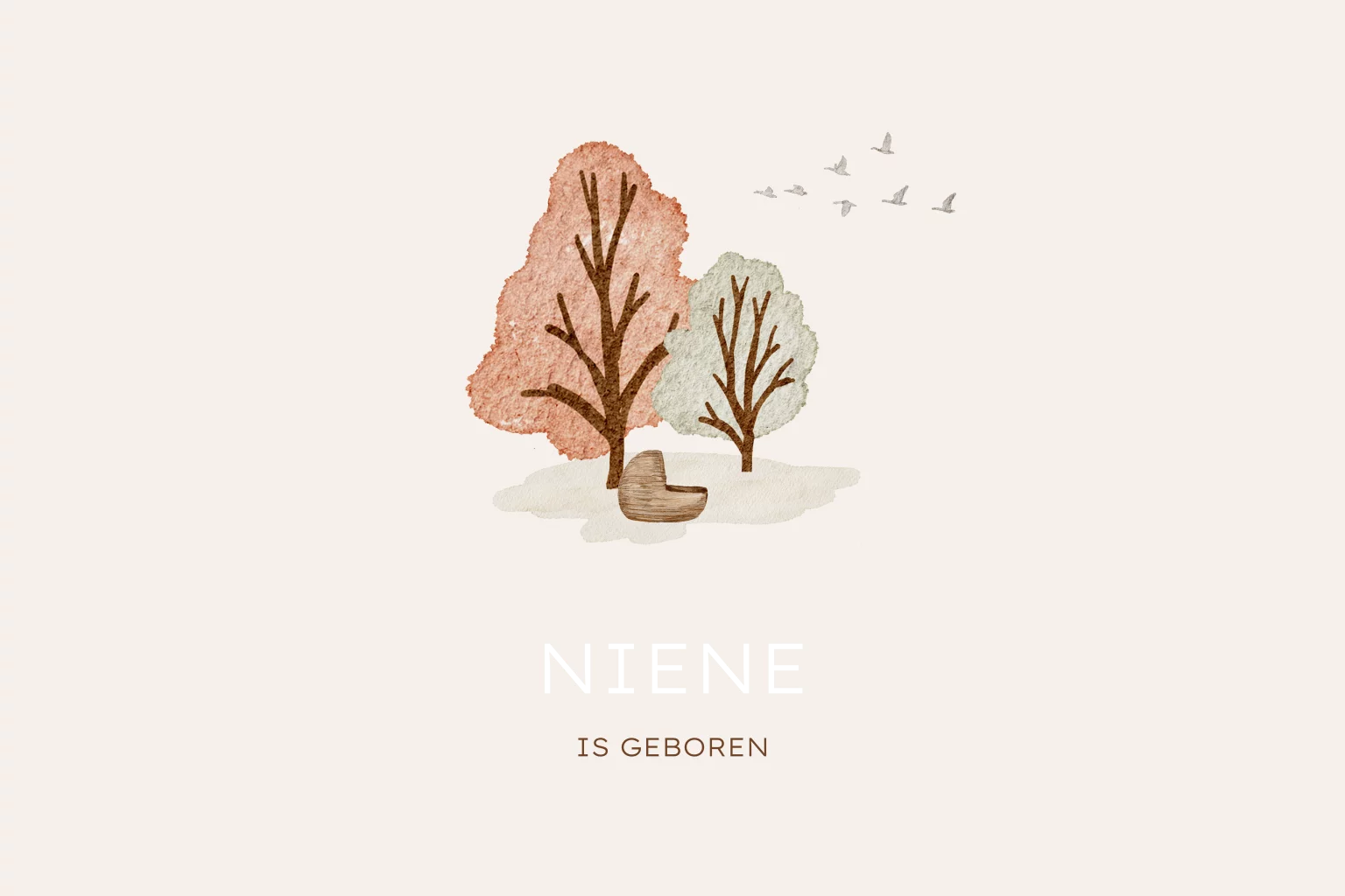 Een lief getekend geboortekaartje met roséfolie naam. De getekende bomen hebben een waterverf effect en een roze en groene kleur. Bij de bomen staat een rieten wiegje met een baby. Dit babykaartje kan je zelf helemaal bewerken en aanpassen.