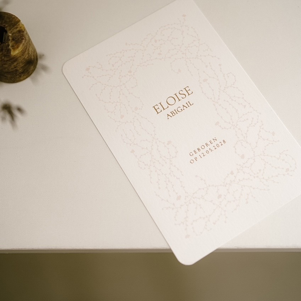 Een mooi geboortekaartje met takjes en bloemen kader. Dit geboortekaartje bloemen rand is perfect voor ouders die houden van een rustige, klassiek stijl. De lichte tinten en de lijntekening geven het kaartje een zachte en stijlvolle uitstraling.