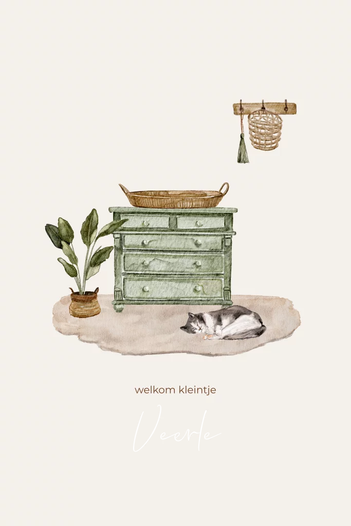 Enkele geboortekaart met een kinderkamer tafereel. Op een kleedje staat een groene commode met een mandje en op de grond ligt een slapende poes. Lief kaartje voor een jongen of meisje wat je zelf kunt bewerken en aanpassen. Je kunt ook de poes vervangen door een hond.