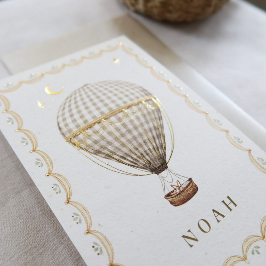 Wat een geweldig mooi kaartje is dit! Op een achtergrond van papier is een luchtballon getekend met een oud groen ruitjes patroon. De buitenrand heeft een handgetekende border in goudkleur en groen. De kaart zit vol goudfolie details zoals de stipjes in de border en de maan en de sterretjes. Uniek kaartje.