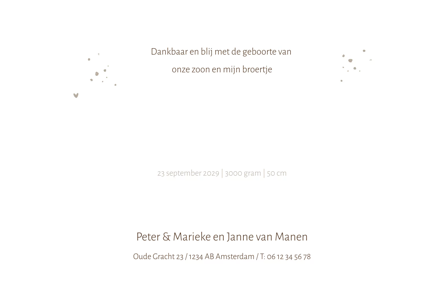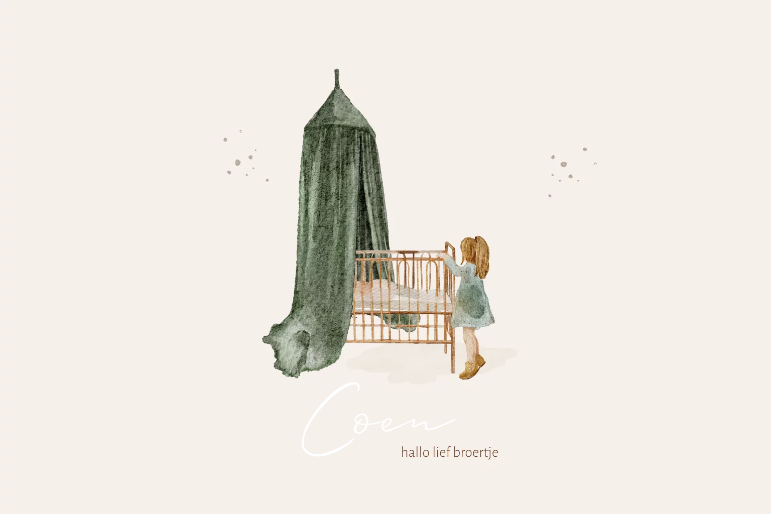 Lief geboortekaartje voor een broertje. In de wieg ligt een baby en de groene klamboe maakt het plaatje heel sfeervol. Bij de wieg staat een zus. Je kunt de illustratie van het meisje ook vervangen voor een jongetje, als jullie oudste kind een zoon is. De naam wordt gedrukt in goudfolie.