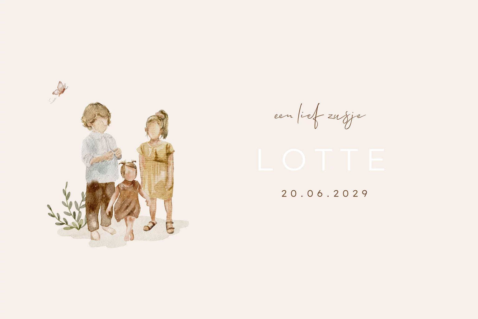 Dit prachtige geboortekaartje voor een derde kindje is voorzien van schattige aquarel illustraties van een grote broer en zus, samen met een lief klein meisje met staartjes. De unieke toevoeging van goudfolie maakt dit meisjeskaartje extra bijzonder. Het babykaartje is volledig aanpasbaar naar jullie wensen, zodat het perfect past bij jullie gezinssituatie.