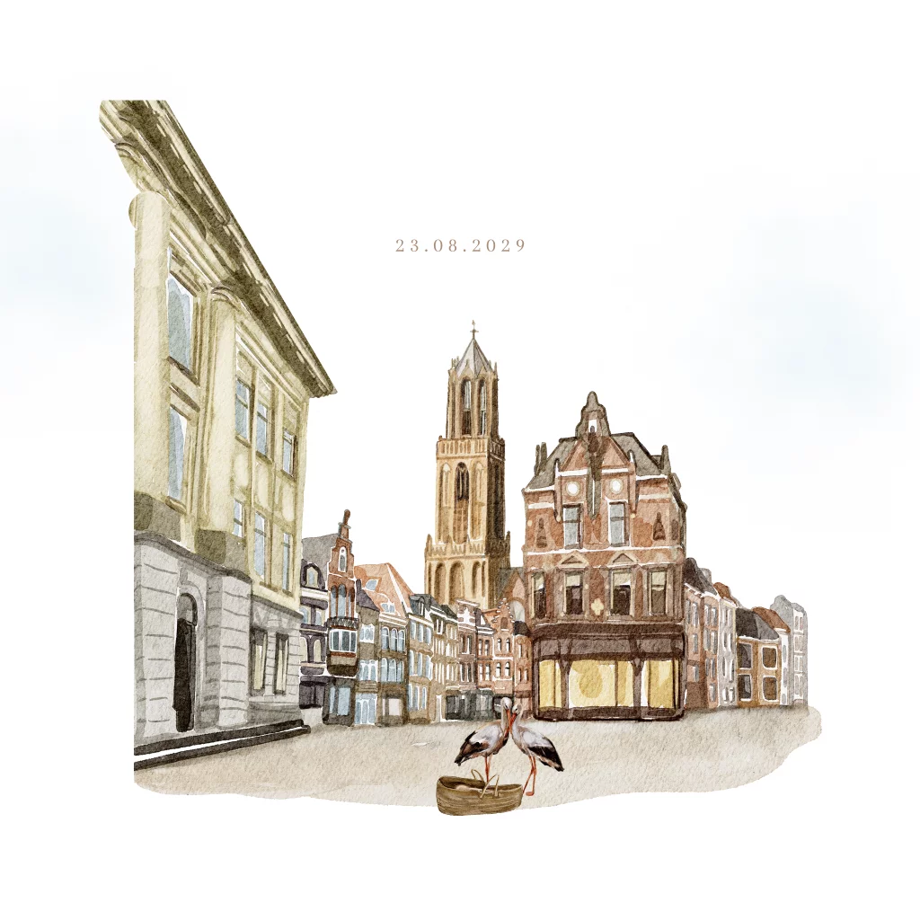 Ben je op zoek naar een uniek en persoonlijk geboortekaartje van de stad Utrecht? Dit getekende geboortekaartje is perfect voor iedereen die in Utrecht woont! Het kaartje bevat herkenbare elementen van de stad, zoals de iconische Domtoren. Om het geboortekaartje extra speciaal te maken, staan er twee ooievaars afgebeeld bij een mandje met een baby. Deze unieke stedenkaartjes zijn ook verkrijgbaar voor andere steden. Vraag gerust om advies voor een persoonlijk geboortekaartje dat helemaal past bij jullie wensen!