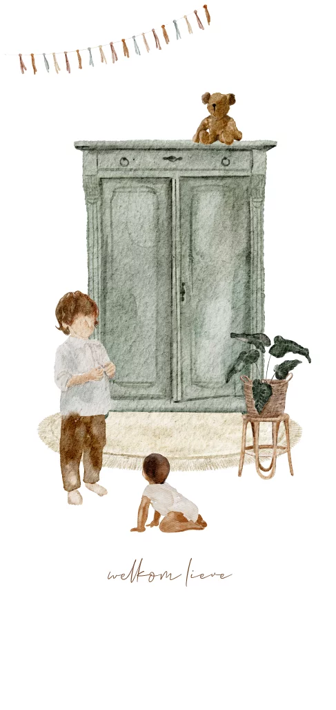 Getekende geboortekaartjes vind je bij Fientje en Co. Zoals dit staand geboortekaartje voor een zusje. Het kaartje heeft een ontwerp van een kinderkamer met een kast met een beer erop en een kamerplant. De grote broer staat in de kamer en kijkt naar de baby op de grond. De naam wordt gedrukt in glanzend goudfolie. Alle illustraties staan los op het kaartje en kan je zelf verschuiven, of nieuwe tekeningen toevoegen. Onze beeldbank staat vol unieke illustraties om je geboortekaartje echt persoonlijk te maken.