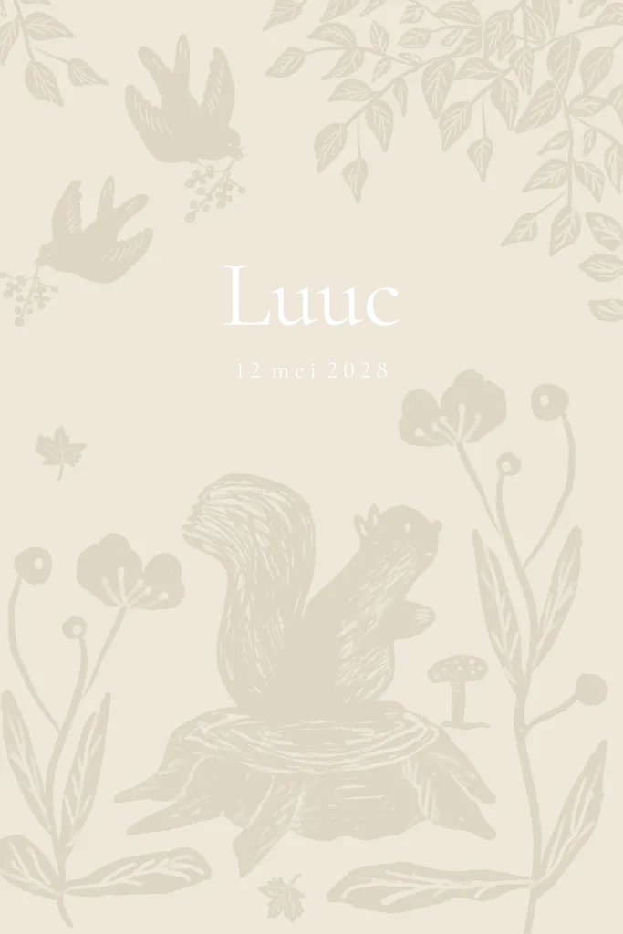 Dit geboortekaartje is perfect voor een herfst baby in naturel tinten. Met illustraties van dieren zoals vogels en een eekhoorn brengt dit kaartje de natuurlijke schoonheid van de herfst tot leven met een linosnede effect.