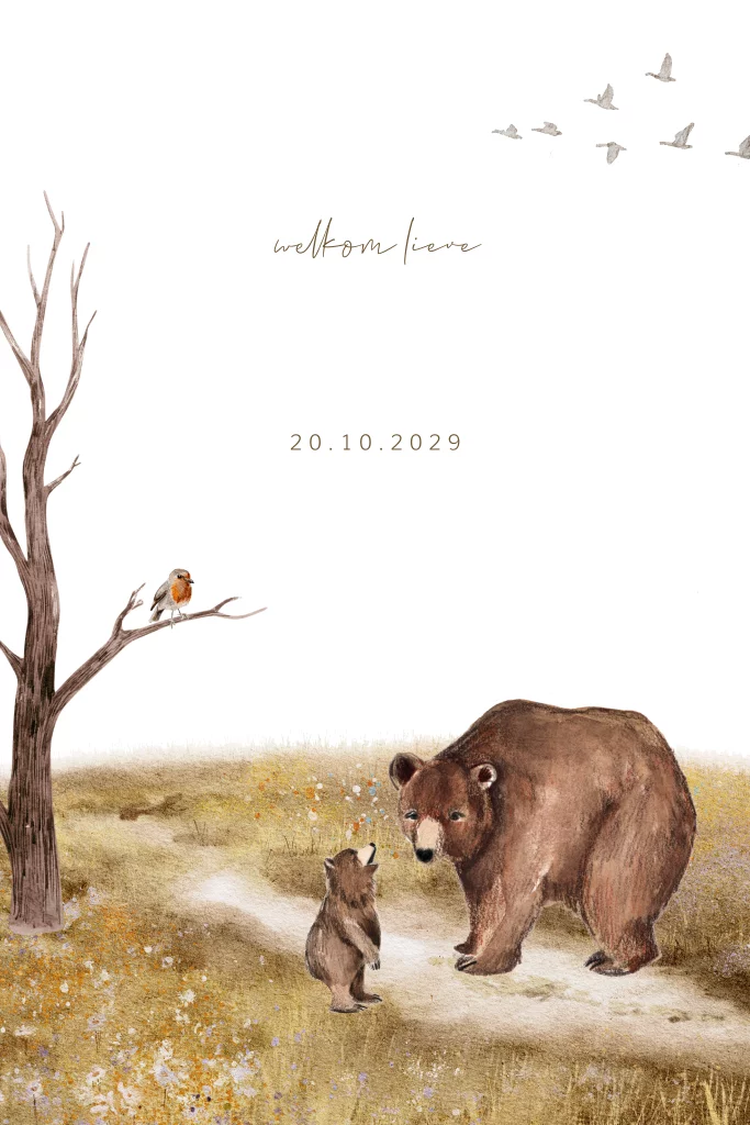 Herfst geboortekaartjes maak je bij Fientje en Co. Uniek getekend herfst geboortekaartje met bruine beren. Een grote beer staat in een veld met een klein beertje. In de boom zit een roodborstje. Met de naam in goudfolie gedrukt krijg je een prachtig en lief babykaartje voor jullie zoon.