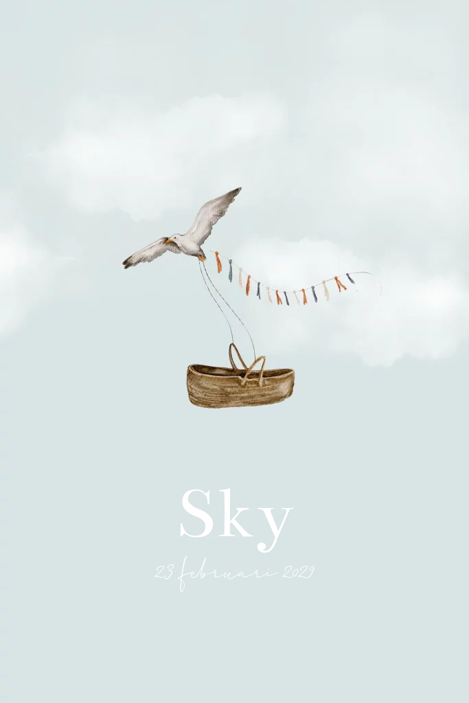 Geboortekaartje voor een jongen met vogel in lucht mandje en slingers