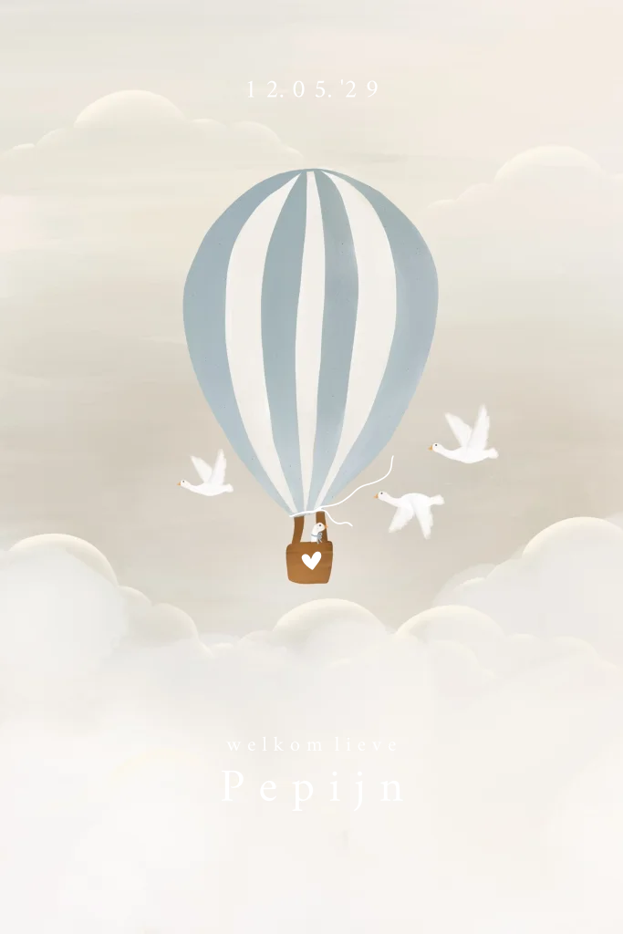 Een mooi uniek geboortekaartje. Helemaal in de wolken, met gansjes en een luchtballon. In beige en lichtblauwe tinten en goudfolie.