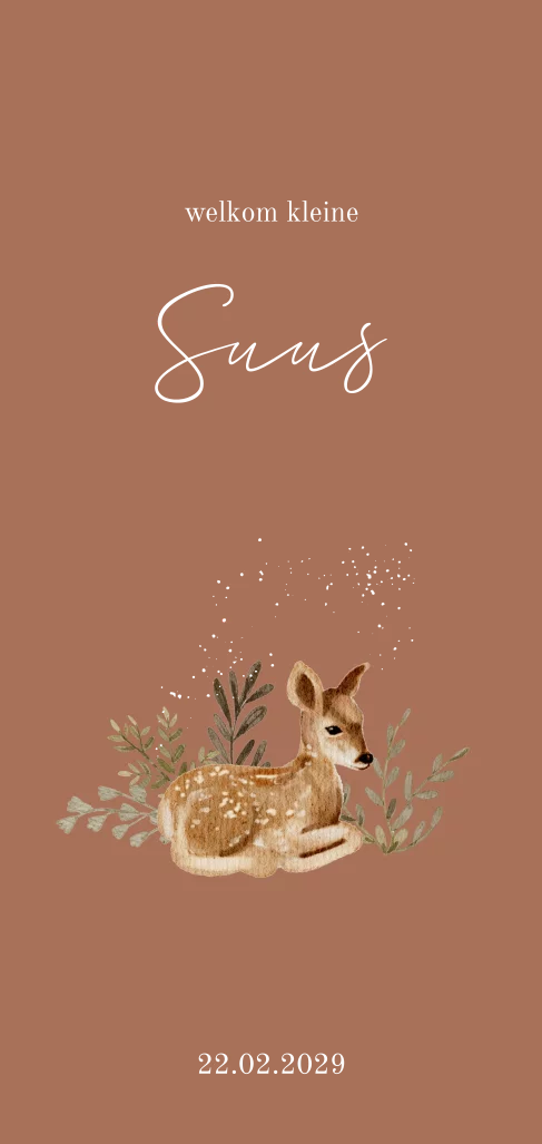Een geboortekaartje voor een meisje met een getekend hertje en takjes. De naam en de stipjes kunnen gedrukt worden in goudfolie. Een uniek en trendy kaartje met een lieve uitstraling en hippe kleuren.