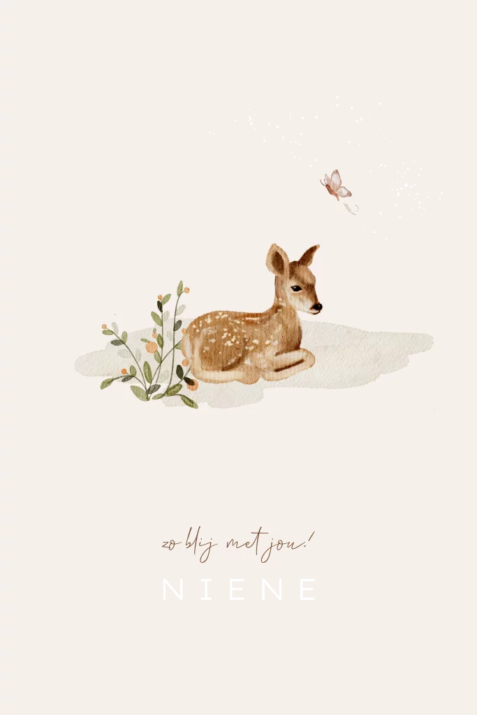 Zoek je een lief zomer geboortekaartje voor jullie dochter? Bekijk dan dit schattige kaartje met een hertje eens. Het hertje zit bij een zomers struikje en er vliegt een vlinder. De roséfolie spetters en naam maken dit babykaartje voor jullie meisje helemaal af.