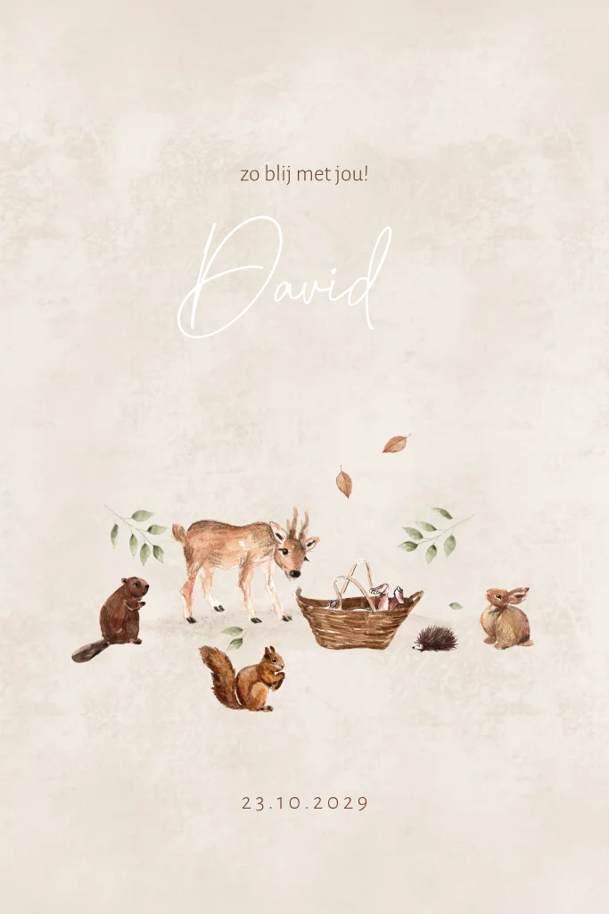 Geboortekaartje met getekende bosdieren eekhoorn egel en hertje