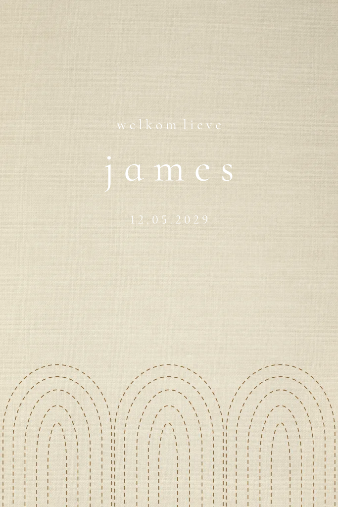 Een mooi chique geboortekaartje met een linnenlook achtergrond in zand kleur. De lijntjes van de bogen en alle teksten kunnen gewijzigd worden van kleur. De naam wordt gedrukt on glanzend goudfolie, maar kan je ook aanpassen in kleur.