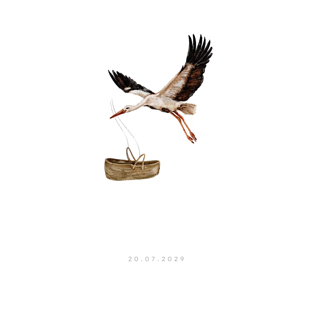 Geboortekaartje met een vliegende ooievaar en een mand in zijn snavel