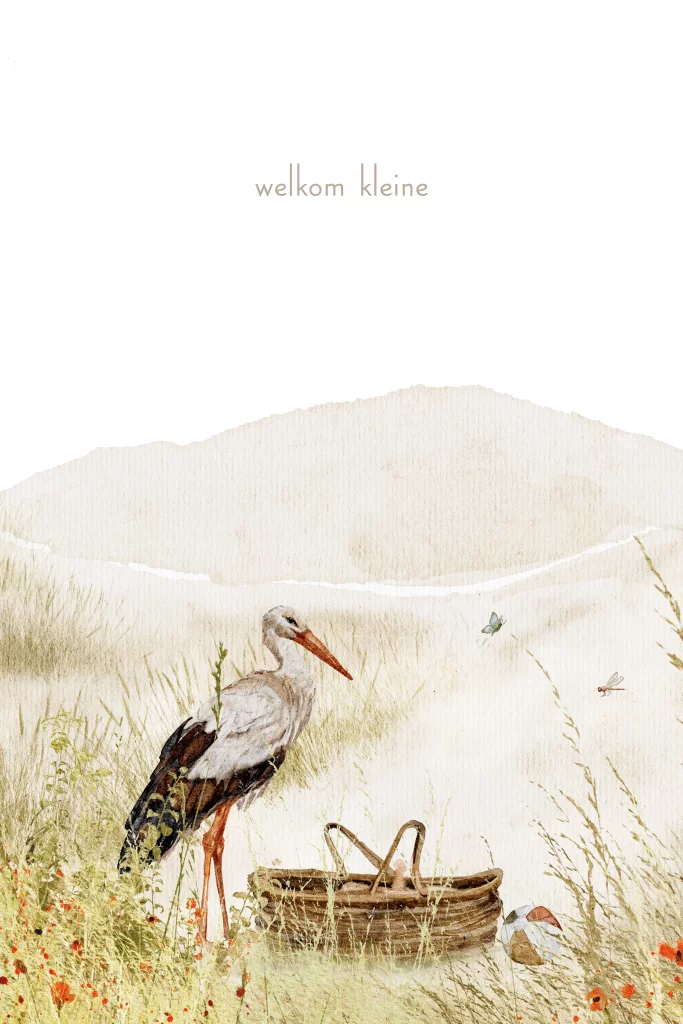 Geboortekaartje ooievaar in duinen getekend veldbloemen zomer
