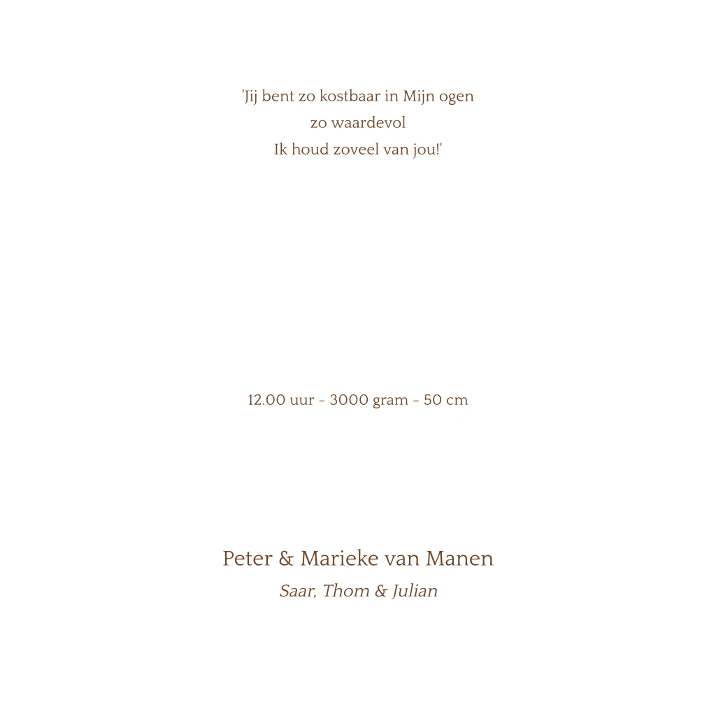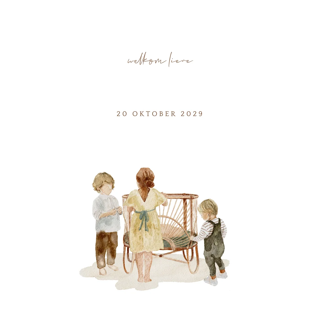 Unieke geboortekaartjes voor een vierde kindje maak je bij Fientje en Co. Dit geboortekaartje voor het vierde kind straalt liefde en elegantie uit. Het toont een prachtige wieg, omringd door een grote zus, een broer en een schattig klein broertje. De naam van jullie nieuwe aanwinst wordt gedrukt in glinsterend goudfolie, wat het kaartje extra elegantie geeft. De aanpasbare gezinssamenstelling stelt jullie in staat om het kaartje perfect te laten aansluiten bij jullie eigen gezin. Dit geboortekaartje is perfect voor ouders die op zoek zijn naar een stijlvol en rustig ontwerp. De zachte aquarel tekeningen en de toevoeging van goudfolie zorgen voor een luxe uitstraling, terwijl de afbeelding van de wieg en de broers en zus een gevoel van warmte en geborgenheid oproepen.