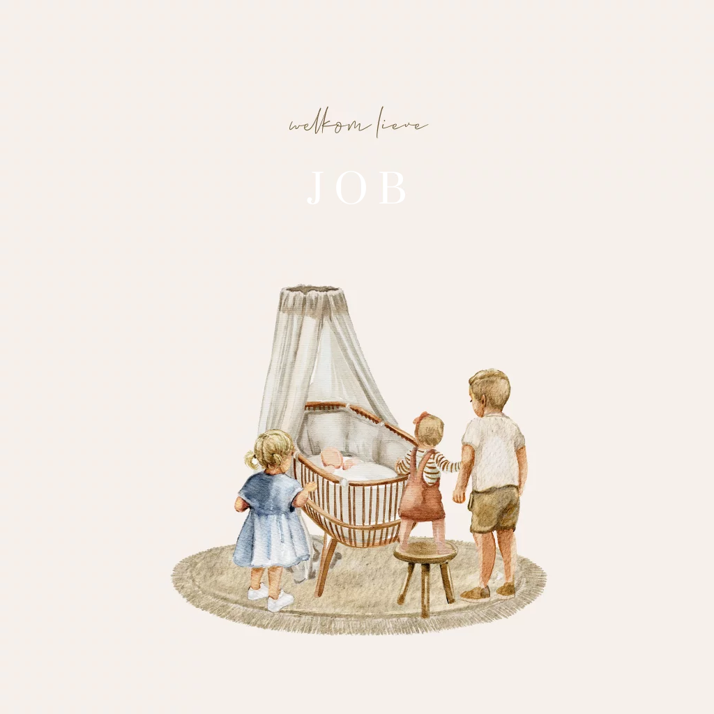 Lief geboortekaartje voor een vierde kindje. In de wieg ligt een baby en daarom heen staan de oudere kindjes. Getekend aquarel kaartje voor een jongen of een meisje. De oudere kindjes kan je vervangen als je een andere gezinssamenstelling hebt. De naam wordt gedrukt in mooi goudfolie voor een extra chique effect.