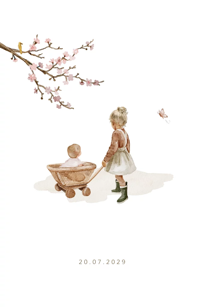 Lief geboortekaartje voor een zusje in een zomer thema. In het midden staat een grote zus bij een zusje in een bolderkar. En de kindjes op deze kaart kan je vervangen als jullie oudste een jongetje is. De roze bloesem maakt er een vrolijk lentekaartje van.